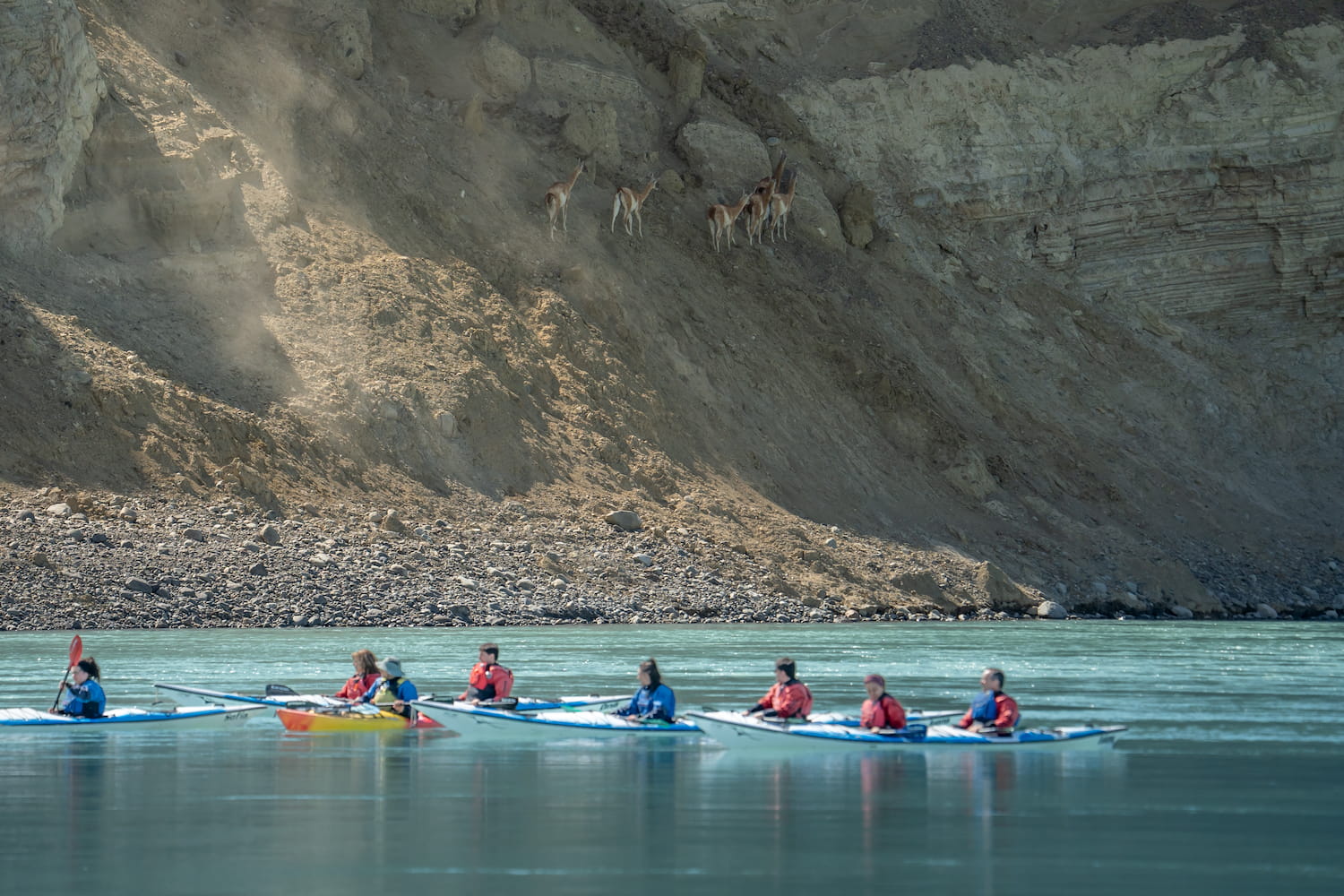 Comienza entonces la navegación en kayak doble, descendiendo 15 km río abajo durante aproximadamente 90 minutos, en un entorno natural imponente donde se observan formaciones geológicas, aves y fauna autóctona. Cada tramo de este recorrido revive el espíritu explorador de Darwin.