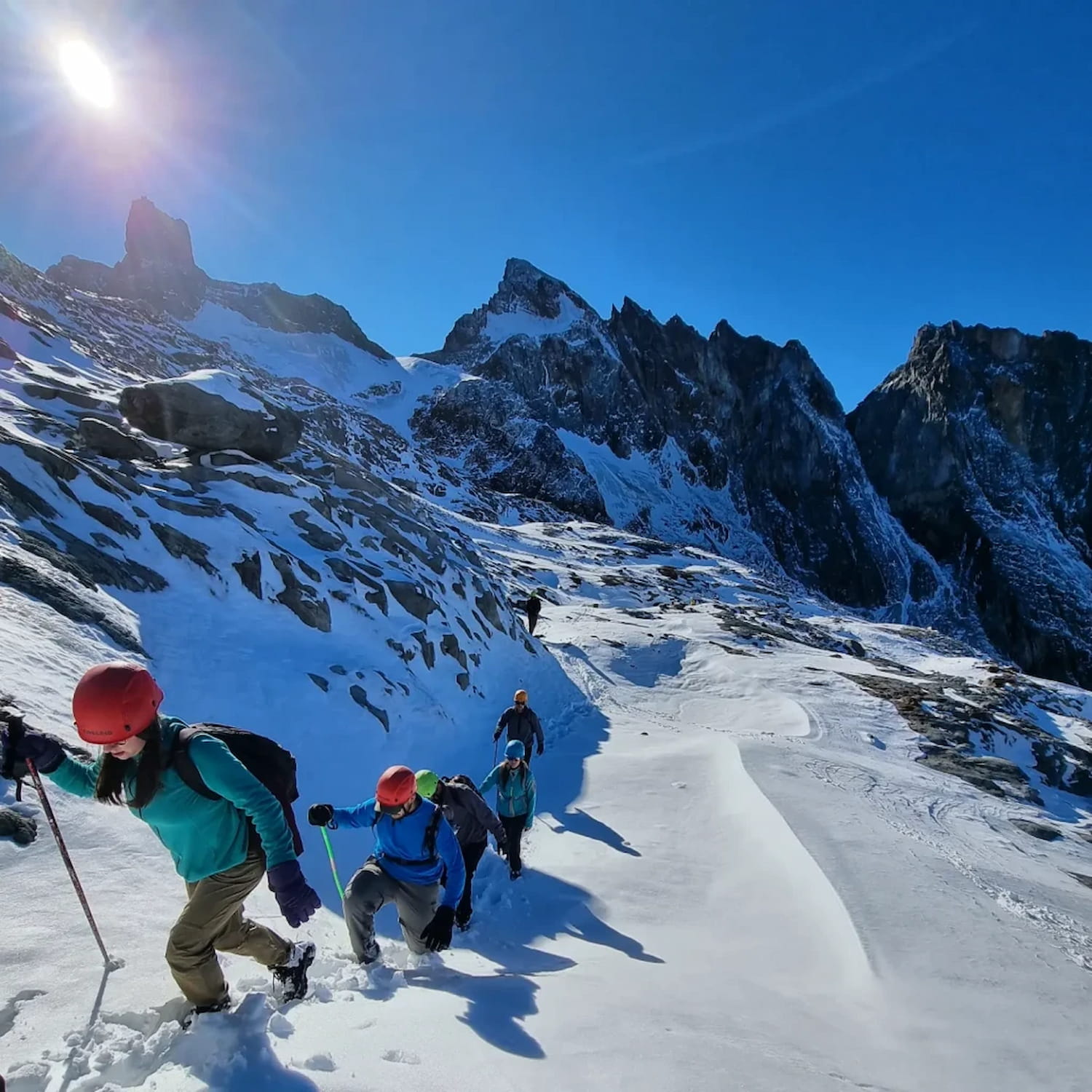 Desde este punto se busca el paso más adecuado para encarar el tramo final hacia el Glaciar Ojo del Albino, considerado el sector más técnico de la excursión. Aquí el guía asiste al grupo utilizando cuerdas y mosquetones para superar los obstáculos con seguridad. Una vez en el glaciar, con las imponentes Torres de Rhino como telón de fondo, se disfruta del paisaje mientras se comparte la vianda y una sopa caliente antes de iniciar el descenso.